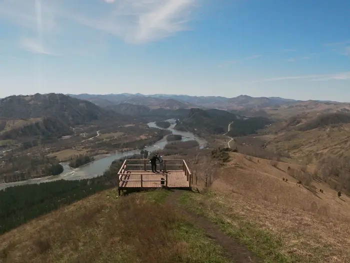 Еще 2,5 км по хребту — и вы на уединенной площадке над Катунью, куда туристические группы обычно не добираются. Привал здесь — это не просто передышка. Это момент, когда гид рассказывает легенду о воине Куюме, и вдруг скала, на которую вы только что смотрели, словно оживает: вы видите не просто горный выступ, перед вами словно вырастает палец мифического героя! Вы не только наслаждаетесь живописным пейзажем, но и проживаете леденящую историю об этом бесстрашном воине.