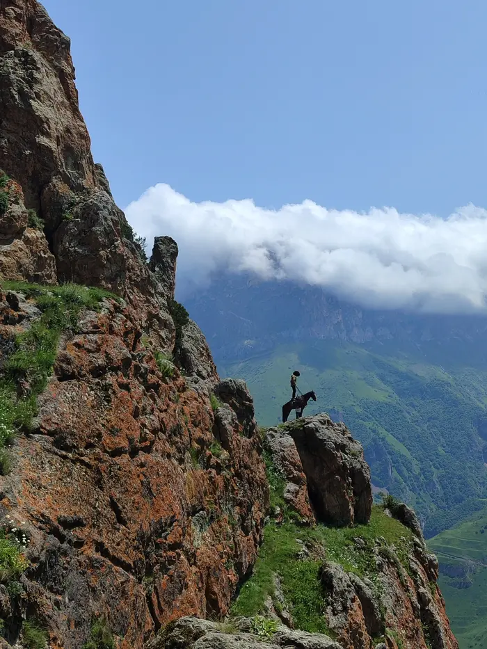 Скальный выступ, нависающий над 170-метровой пропастью. Кавказский ответ норвежскому Trolltunga — но с характером: ветер, высота 4000 м и панорама, от которой захватывает дух. Один шаг — и вы на краю мира. Это место требует смелости, но дарит чувство абсолютной свободы.