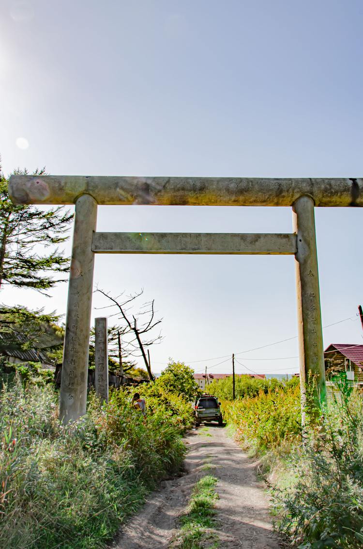 10:30 — деревня Взморье. Первая остановка и первый сюрприз: посреди сахалинского пейзажа — японские ворота Тории. Молчаливые, древние, они стоят здесь с эпохи Карафуто как приглашение в другое время. Разминка, кофе — и снова в путь.